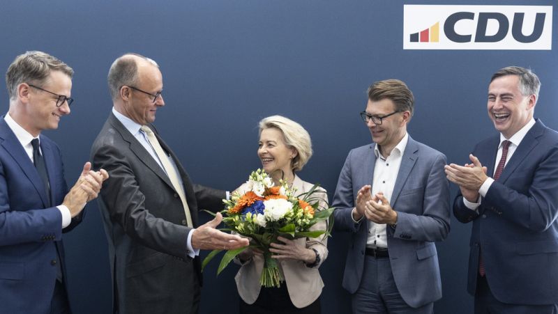 Archivbild: CDU-Generalsekretär Carsten Linnemann, Kanzler Friedrich Merz, EU-Kommissionschefin Ursula von der Leyen und die CDU-Europaabgeordneten Daniel Caspary und David James McAllister (v.l.n.r.) haben ihren Spaß auf einem Treffen in Berlin (10. Juni 2024)